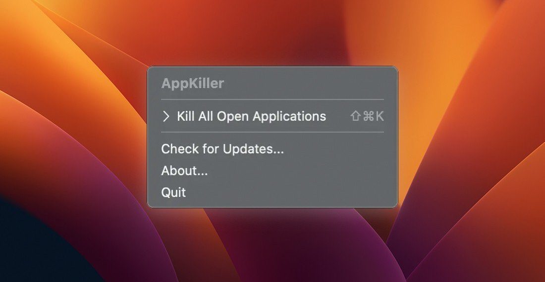 AppKiller 的魅力在于其低调设计,它悄然藏身于 Mac 的菜单栏,不会干扰你的视线,却随时待命执行任务。核心操作只需点击图标或按下快捷键,就能完成全局关闭,避免了 macOS 原生 Activity Monitor 的繁琐步骤。