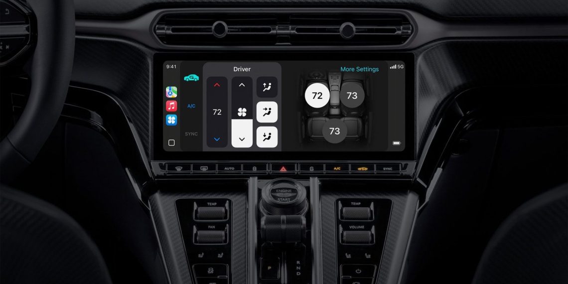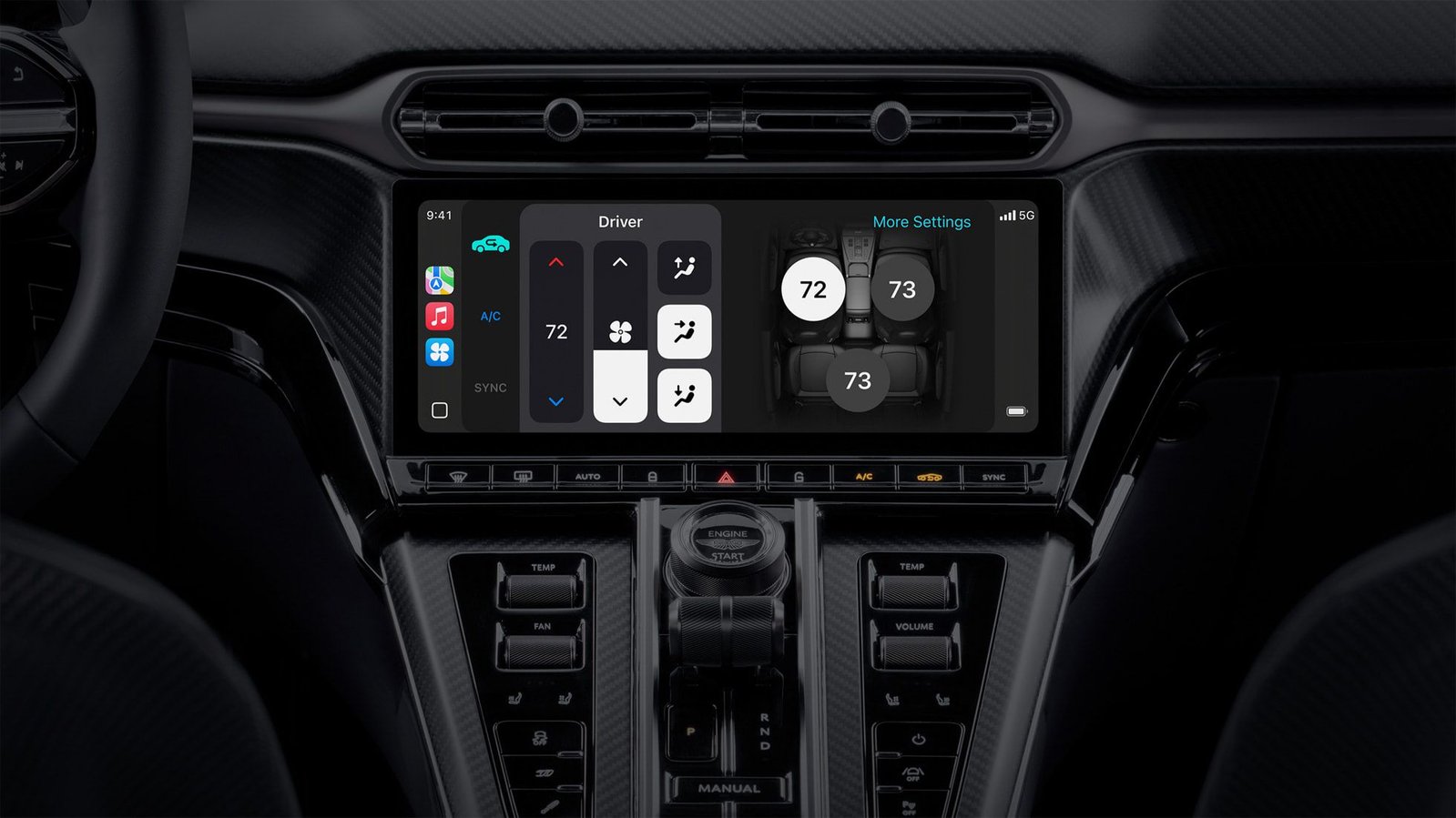 CarPlay Ultra深度整合车辆仪表盘与控制系统,内置收音机和空调应用,支持可定制小组件。界面可根据车型品牌定制,驾驶员可选择多种预设设计风格。连接iPhone提供应用数据,车辆则提供实时车速、胎压等行驶数据。
