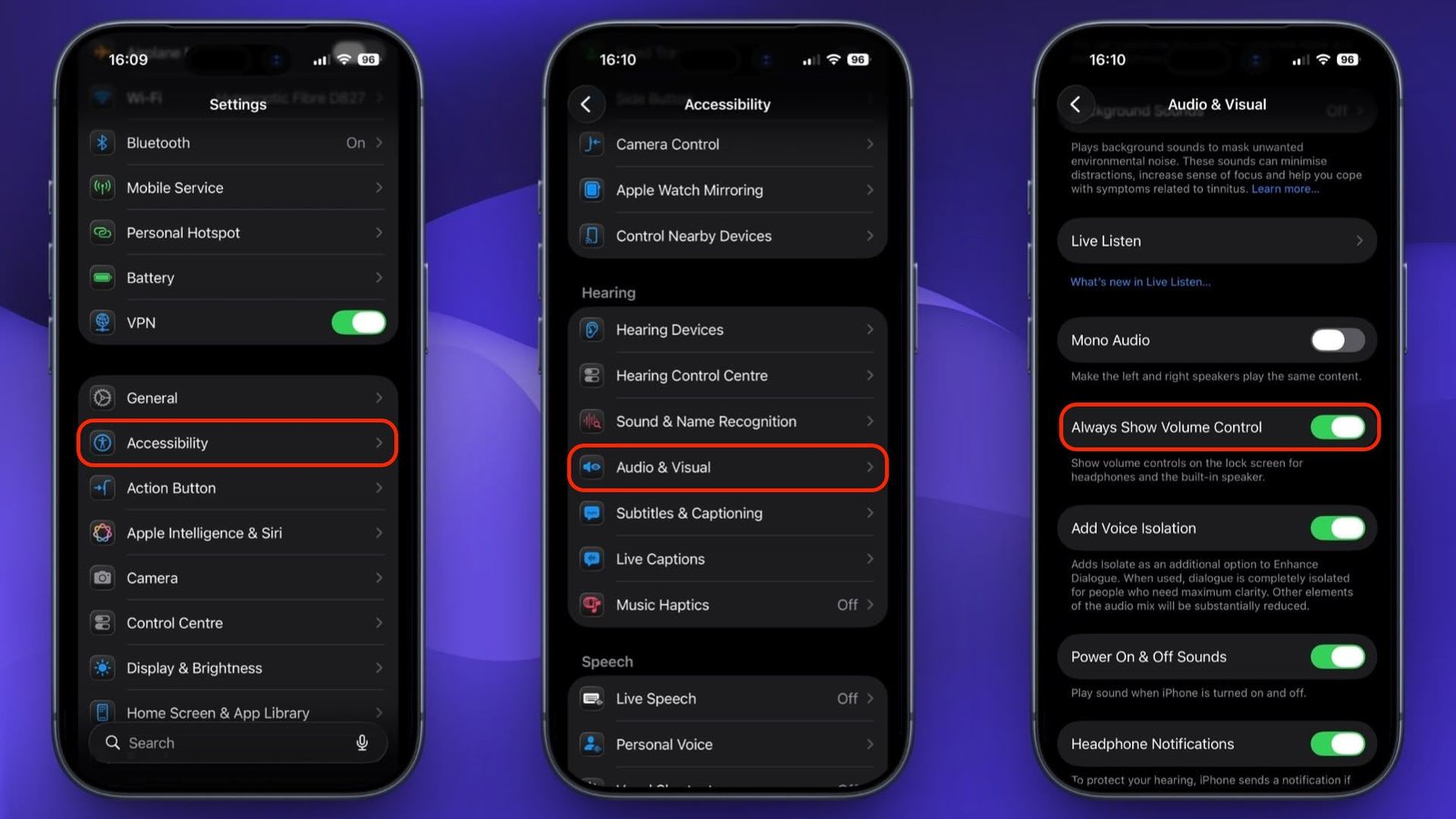 以前苹果在锁屏的音乐播放器里默认就带音量滑块,后来在 iOS 16 的时候悄悄给去掉了。直到 iOS 18.2 才又把它加回来,不过藏在了辅助功能设置里,很容易被忽略。现在 iOS 26 里这个功能还在,而且开启起来特别简单。