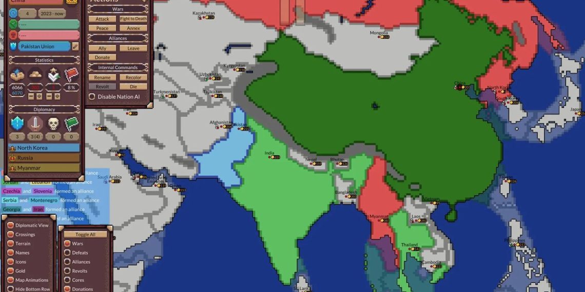 2025年7月的 v4.1.1 带来了小修小补,主要是稳定性提升,而 v4.1.0 的随机名称设置界面则让创建国家更便捷,避免了重复命名烦恼。 整体而言,这些更新显示出开发者对平衡AI行为和经济系统的重视,早期的版本更偏向混乱厮杀,现在则融入了更多战略元素。 如果你下载了 itch.io 版本,还能访问旧版分支,比较前后差异,感受游戏的成长轨迹。