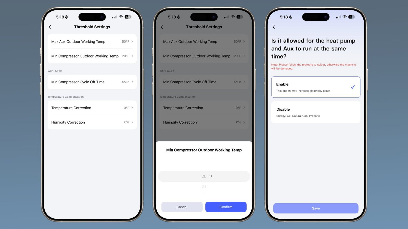 测试期间我遇到一个问题,到现在还没解决。温控器有个“压缩机最低室外工作温度”设置,最低只能设到20华氏度。这让我觉得它到这个温度就会切换到辅助加热,但我并不希望这样。现在很多新款冷气候热泵能在20度以下正常工作,而我家的辅助加热是电的,用起来很贵。我问过Aqara,他们建议在辅助设置里关闭“启用热泵工作”选项,但安装引导里又说如果辅助加热是电的,就要同时启用辅助和热泵设置。App里还提示“请按提示选择,否则可能损坏设备”。我不是HVAC专家,真不敢随便选错。