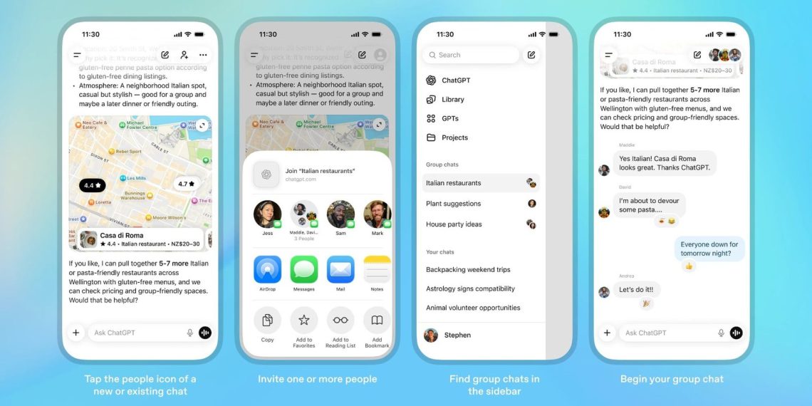 通过群聊功能,ChatGPT 用户可以创建一个共享的对话空间,并邀请朋友、家人或同事加入。群聊与私人对话相互独立,OpenAI 表示,群聊创建者的个人 ChatGPT 记忆绝不会与聊天中的任何人共享。