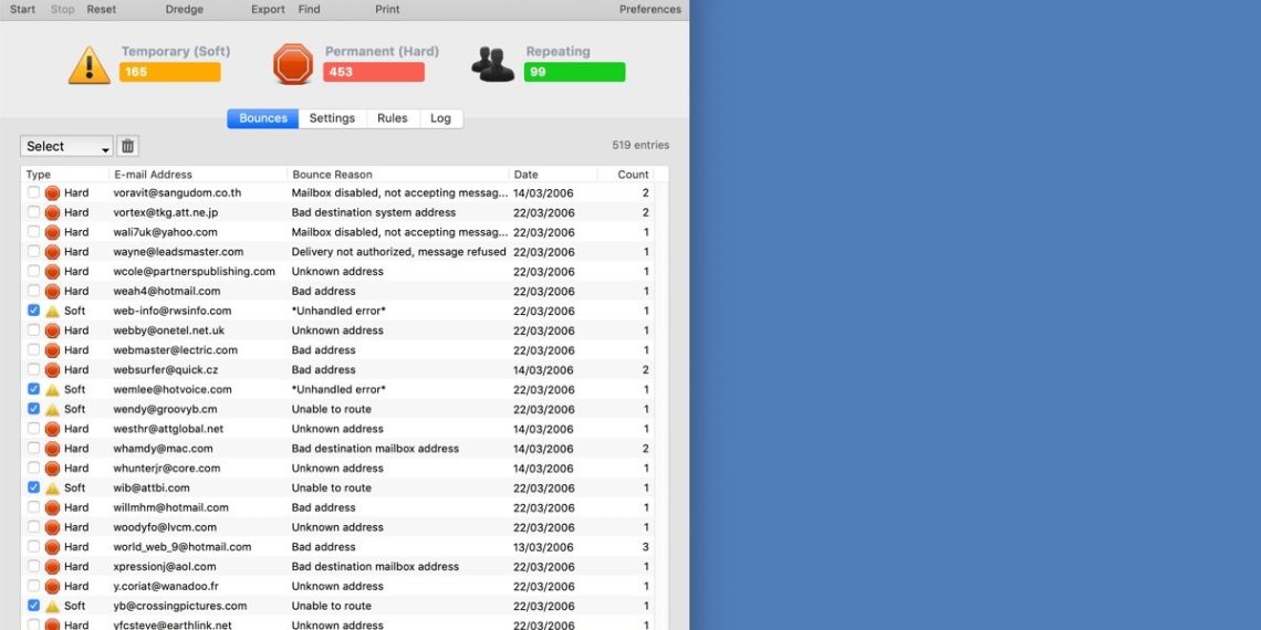 实际用下来,最让我印象深的是它的规则系统。软件内置了不少默认规则,据说能覆盖到99.9%的常见退信类型,你还可以自己加规则或者改改,灵活性很高。处理完之后,它会列出那些“dead”地址,导出也简单,直接就能拿去清理列表或者试着重发一次。支持 DSN 投递状态通知,还有增强邮件系统状态码,这对专业用户来说挺实用的。