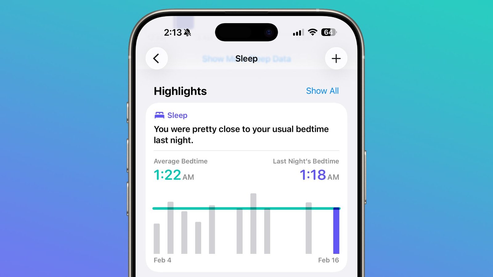 iOS 26.4 在健康 App 的睡眠部分新增了「平均就寝时间」指标,让你更清楚地了解就寝时间对睡眠质量的影响。