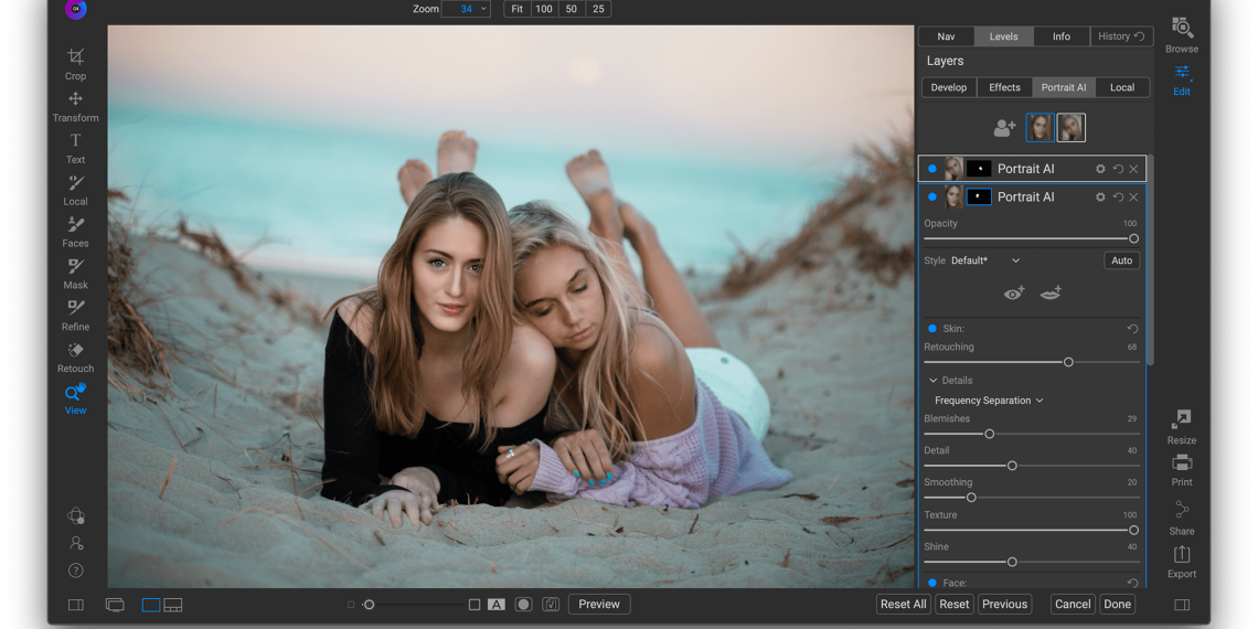 生成式抹除功能可快速移除画面干扰物并自然填充背景,内容感知裁切能在调整构图时自动补全画布。NoNoise AI与TackSharp AI的组合实现了降噪与锐化的智能平衡,在保留细节的同时消除杂色。特别值得一提的是,NoNoise AI 2026能更有效地分辨图像噪点和细节纹理,在消除高ISO噪点的同时,最大限度地保留图像锐度和细节。