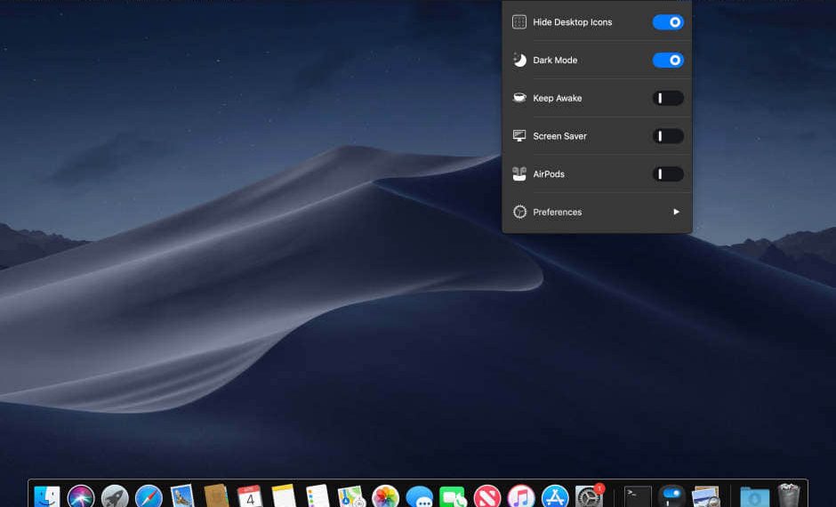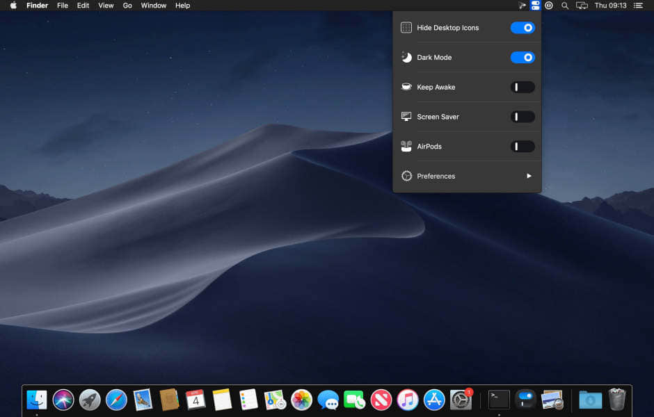 我第一次用的时候,就觉得它设计得挺聪明。不是那种塞满一堆功能的臃肿工具,而是精简到刚好够用。核心功能包括一键隐藏桌面图标——我桌面总是一团乱,用它点一下就干净了;还有随时切换深色模式,这个在不同光线下切换特别方便;Keep Awake 功能能让 Mac 保持唤醒状态,不让它自动睡过去或者跳屏幕保护;手动开启屏幕保护程序也行;最实用的是 AirPods 快速连接,一秒钟就配对好了。