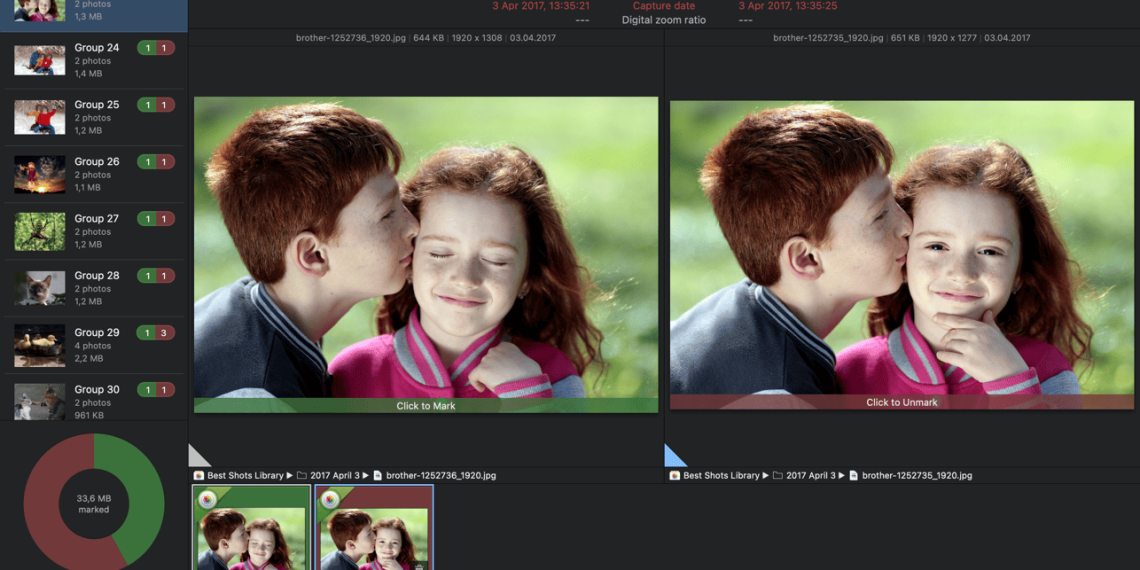 在用户界面设计方面,PhotoSweeper X 5.0.4体现了直观高效的理念。软件提供三种结果查看模式:”One by One”(单张详查)、”Face-to-Face”(双图对比)和”All in One”(全局概览),满足不同用户的浏览偏好。扫描结果以视觉缩略图方式清晰展示,并按相似度分组排列,每组照片都明确标注了文件大小、尺寸、拍摄时间等关键信息,便于用户做出删除决策。独特的”差异高亮”功能能够直观显示相似照片间的细微差别,这对判断哪张照片更值得保留提供了宝贵参考。