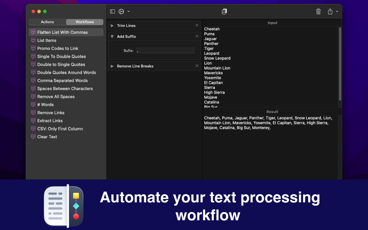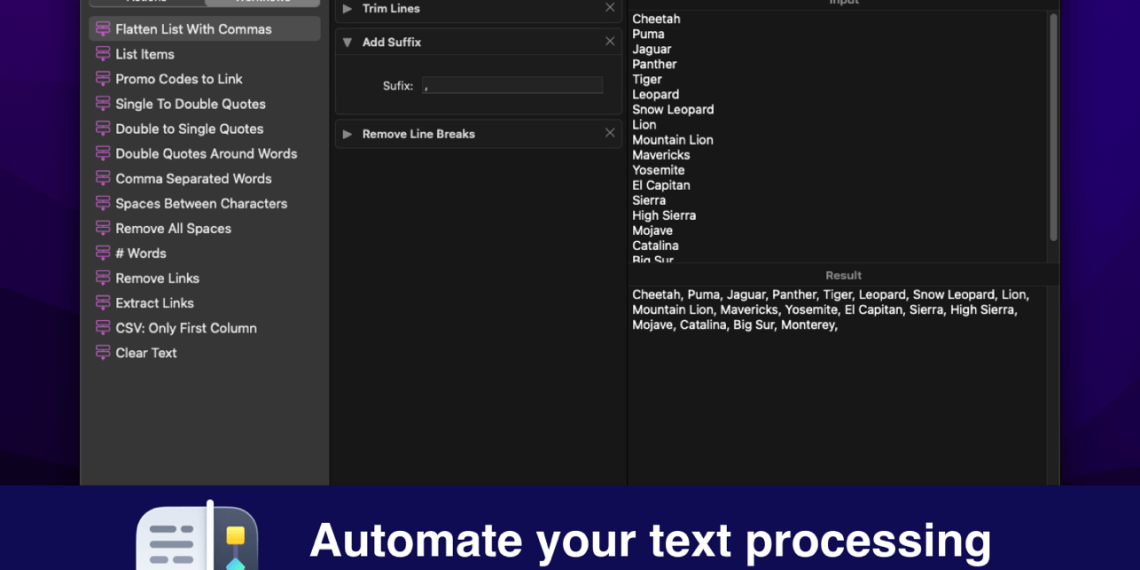 开发者可以使用 Text Workflow 2.5 快速格式化日志文件、清理代码或转换数据格式;撰稿人和编辑可以用它来统一文章风格、检查标点使用规范;学生和研究人员则能利用其处理参考文献格式、整理研究数据。该工具通过减少重复性操作,让用户能更专注于内容本身而非格式调整。