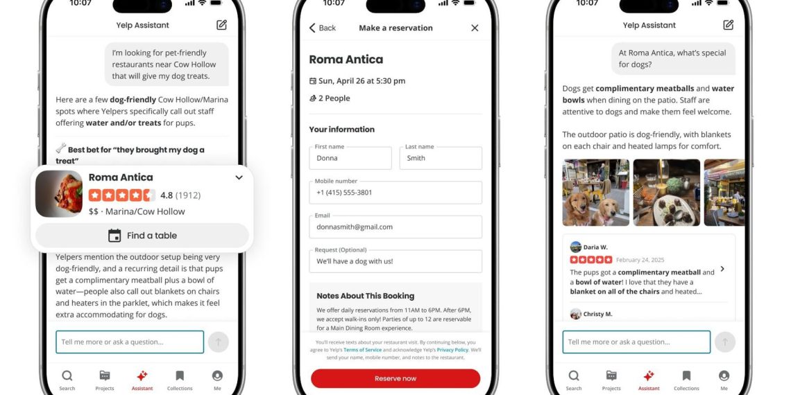 有了这个AI助手,你可以先聊天问清楚哪个地方合适,然后在同一个对话里直接预约、订座位、下单外卖,或者索要报价。Yelp还新增了Vagaro、Zocdoc和Calendly这些集成服务。